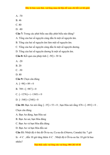 Câu 8: Kết quả của phép tính (−50) + 30 là A. -20 B. 20 C. -30 D. 80