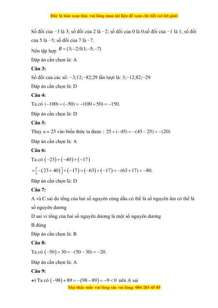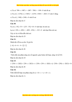 D sai vì tổng của hai số nguyên dương là một số nguyên dương B đúng Đáp án cần chọn là: B Câu 8: Ta có ( 50 − ) + 30 = − 50 ( − 30) = −20. Đáp án cần chọn là: A Câu 9: +) Ta có ( 98