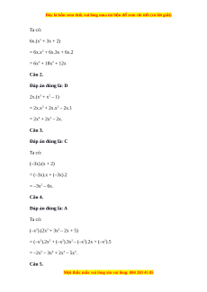 Câu 2. Tính 2x.(x3 + x2 – 1) = ? A. 2x4 + 2x3 – x; B. 2x4 + 2x3 + 2x; C. 2x4 + 2x3; D. 2x4 + 2x3 – 2x.