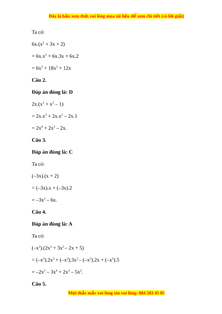 Câu 1. Tính 6x.(x2 + 3x + 2) = ? A. 6x3 + 18x2 + 12x; B. 6x3 + 18x2 – 12x; C. x3 + 18x2 + 12x; D. 6x3 + 18x2.