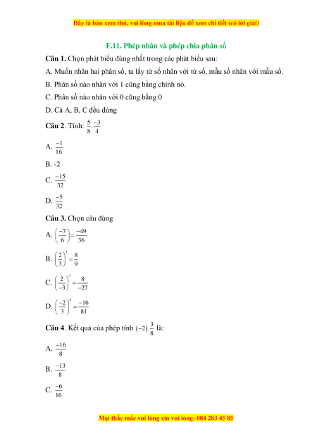 C. Phân số nào nhân với 0 cũng bằng 0 D. Cả A, B, C đều đúng 5 3 − Câu 2. Tính: . 8 4 −1 A. 16 B. -2 −15 C. 32 5 − D. 32