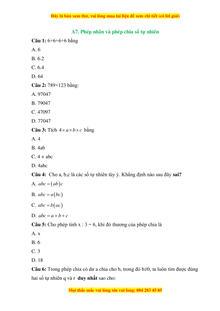A7. Phép nhân và phép chia số tự nhiên Câu 1: 6+6+6+6 bằng A. 6 B. 6.2 C. 6.4 D. 64