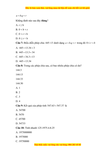Câu 6: Trong phép chia có dư a chia cho b, trong đó b≠0, ta luôn tìm được đúng