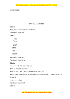 Tổng trên có 4 số 6 nên 6+6+6+6=6.4 Đáp án cần chọn là: C Câu 2: Vậy 789×123=97047 Đáp án cần chọn là: A Câu 3: