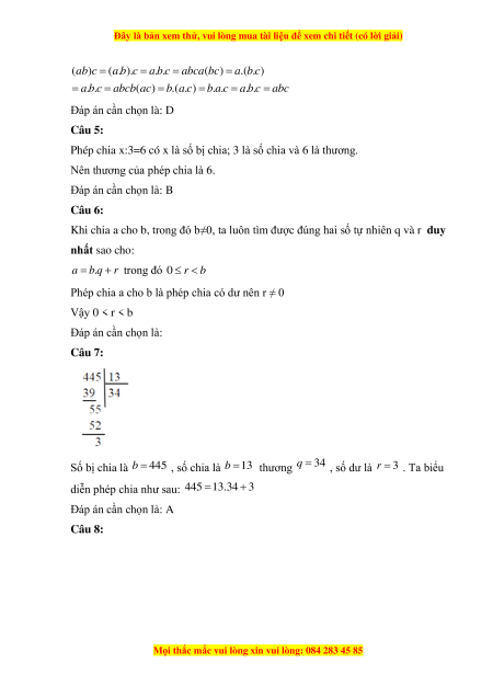 Nên thương của phép chia là 6. Đáp án cần chọn là: B Câu 6: