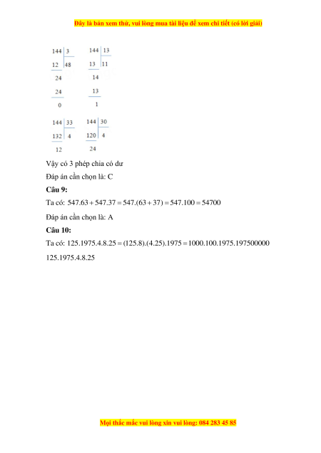 Câu 8: Trong các phép chia sau, có bao nhiêu phép chia có dư? 144:3 144:13 144:33 144:30 A. 1 B. 2 C. 3 D. 4