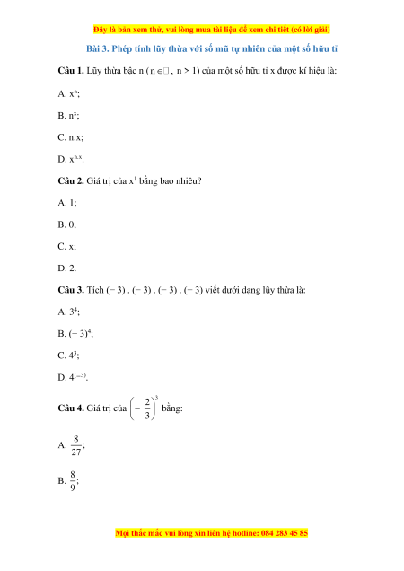 Câu 1. Lũy thừa bậc n ( n , n > 1) của một số hữu tỉ x được kí hiệu là: A. xn; B. nx; C. n.x; D. xn.x.