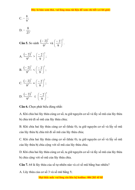 C. − 8 ; 9 D. − 8 . 27 (− 2)2 2 − 2 Câu 5. So sánh và . 2 9 9 (− 2)2 2 − 2 A. > ; 2 9 9 (− 2)2 2 − 2 B. < ; 2 9 9 (− 2)2 2 − 2 C. = ; 2 9 9 (− 2)2 2 − 2 D. . 2 9 9
