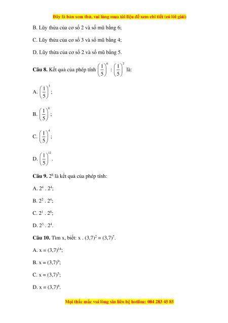 Câu 12. Cho x là số hữu tỉ, x15 biểu diễn dưới dạng lũy thừa của x3 được viết là: A. (x3)6; B. (x3)12; C. (x3)5; D. (x3)15.