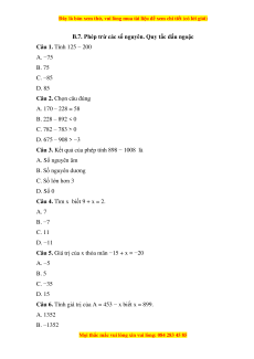 Câu 21. Kết quả của phép tính 23 − 17 là: A. −40 B. −6 C. 40 D. 6