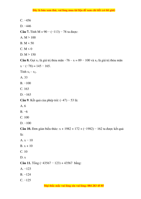 Câu 11. Tổng (−43567 − 123) + 43567 bằng: A. −123 B. −124 C. −125