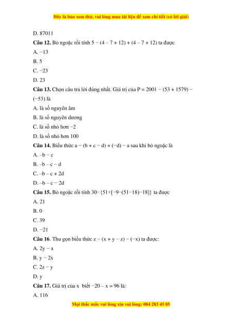 Câu 12. Bỏ ngoặc rồi tính 5 − (4 – 7 + 12) + (4 – 7 + 12) ta được A. −13 B. 5 C. −23 D. 23