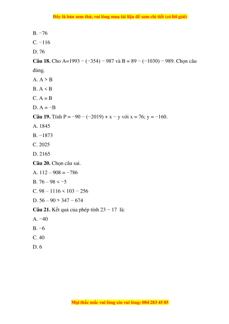Câu 20. Chọn câu sai. A. 112 – 908 = −786 B. 76 – 98 < −5