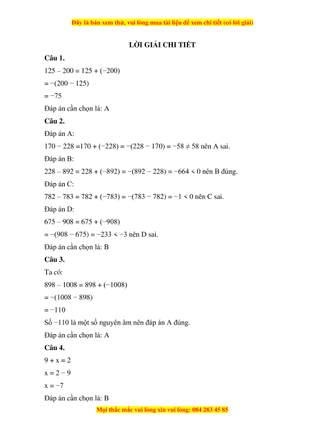 Câu 2. Chọn câu đúng A. 170 – 228 = 58 B. 228 – 892 < 0