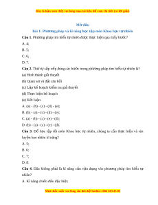 Bài 1: Phư ng pháp và k ơ ĩ năng h c t ọ p m ậ ôn Khoa h c t ọ nhi ự ên Câu 1. Phư ng pháp t ơ ìm hi u t ể nhi ự ên đư c ợ th c hi ự n qua m ệ y b ấ ư c? ớ A. 4; B. 5; C. 6; D. 7. Câu 2. Th t ứ s ự p x ắ p đúng các ế bư c t ớ rong phư ng pháp t ơ ìm hi u t ể nhi ự ên là? (a) Hình thành giả thuy t ế (b) Quan sát và đ t ặ câu h i ỏ (c) L p k ậ ho ế ch ạ ki m ể tra gi t ả huy t ế (d) Th c hi ự n k ệ ho ế ch ạ (e) K t ế lu n ậ