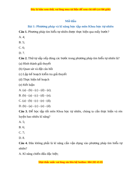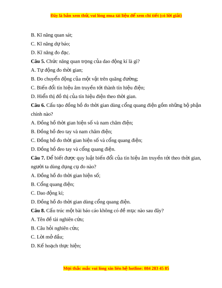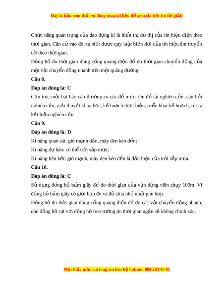 Đây là bản xem th , vu ử i lòng mua tài li u ệ đ xe ể m chi ti t (c ế ó l i ờ gi i ả ) Phư ng pháp t ơ ìm hi u t ể nhi ự ên đư c ợ th c hi ự n qua 5 b ệ ư c ớ l n l ầ ư t ợ nh s ư au: - Quan sát và đ t ặ câu h i ỏ nghiên c u; ứ - Hình thành giả thuy t ế ; - L p k ậ ế ho ch ki ạ m ể tra gi t ả huy t ế ; - Th c ự hiện kế ho ch; ạ - K t ế lu n. ậ Câu 3. Đáp án đúng là: C Để h c ọ t p ậ t t ố môn Khoa h c ọ t ự nhiên, chúng ta c n ầ th c ự hi n ệ và rèn luy n ệ 7 kĩ năng: quan sát, phân lo i ạ , liên k t ế , đo, d báo, ự vi t ế báo cáo, thuy t ế trình. Câu 4 Đáp án đúng là: A Để h c ọ t p ậ t t ố môn Khoa h c ọ t ự nhiên, chúng ta c n ầ th c ự hi n ệ và rèn luy n ệ 7 kĩ năng: quan sát, phân lo i ạ , liên k t ế , đo, d báo, ự vi t ế báo cáo, thuy t ế trình. Câu 5. Đáp án đúng là: D Ch c ứ năng quan tr ng ọ c a ủ dao đ ng ộ kí là hi n ể thị đồ thị c a ủ tín hi u ệ đi n ệ theo th i ờ gian. Trên màn hình c a ủ dao đ ng ộ kí sẽ xu t ấ hi n ệ m t ộ đư ng ờ cong sáng bi u di ể n s ễ ự bi n đ ế ổi c a ủ tín hi u đi ệ n t ệ heo th i ờ gian. Câu 6. Đáp án đúng là: C Cấu t o ạ đ ng ồ hồ đo th i ờ gian dùng c ng ổ quang đi n ệ g m ồ hai bộ ph n ậ chính: đồng hồ đo th i ờ gian hi n s ệ và c ố ng quang đi ổ n. ệ Câu 7. Đáp án đúng là: C M i
