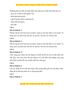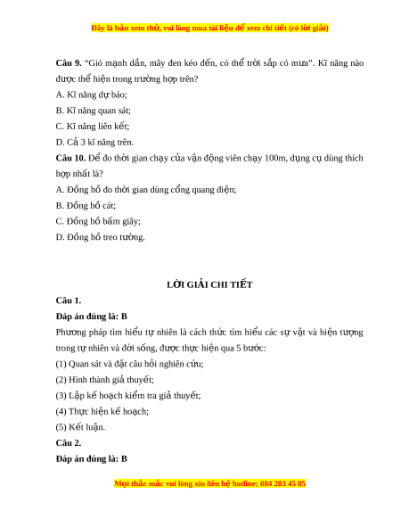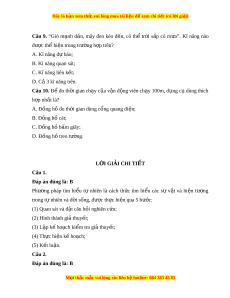 Đây là bản xem th , vu ử i lòng mua tài li u ệ đ xe ể m chi ti t (c ế ó l i ờ gi i ả ) Câu 9. “Gió m nh ạ d n, ầ mây đen kéo đ n, ế có thể tr i ờ s p ắ có m a” ư . Kĩ năng nào đư c t ợ h hi ể n t ệ rong trư ng ờ h p t ợ rên? A. Kĩ năng d báo; ự B. Kĩ năng quan sát; C. Kĩ năng liên k t ế ; D. Cả 3 kĩ năng trên. Câu 10. Đ đo t ể h i ờ gian ch y ạ c a v ủ n ậ đ ng vi ộ ên ch y ạ 100m, d ng c ụ dùng t ụ hích h p nh ợ ất là? A. Đồng hồ đo th i