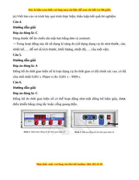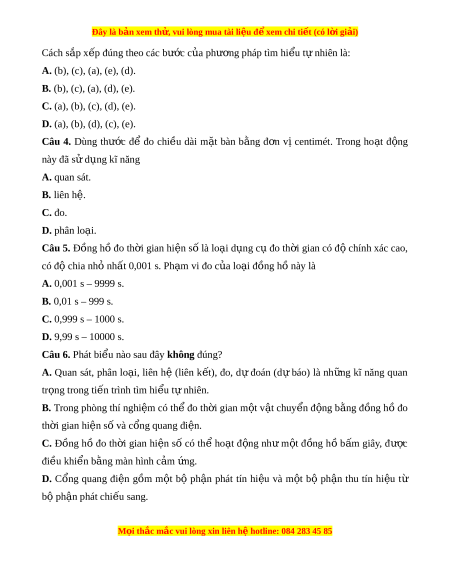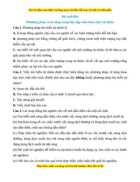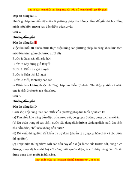 Đây là bản xem th , vu ử i lòng mua tài li u ệ đ xe ể m chi ti t (c ế ó l i ờ gi i ả ) Đáp án đúng là: B Phư ng ơ pháp tìm hi u ể tự nhiên là phư ng ơ pháp tìm b ng ằ ch ng ứ đ ể gi i ả thích, ch ng ứ minh m t ộ hi n t ệ ư ng hay đ ợ ặc đi m ể c a ủ s v ự t ậ . Câu 2. Hư ng d ớ ẫn gi i ả Đáp án đúng là: B Việc tìm hi u ể tự nhiên đư c ợ th c ự hi n ệ b ng ằ các phư ng ơ pháp, kĩ năng khoa h c ọ theo m t ộ ti n t ế rình g m ồ các bư c d ớ ư i ớ đây: Bư c 1: ớ Quan sát, đ t ặ câu h i ỏ Bư c 2: ớ Xây d ng ự gi t ả huy t ế Bư c 3: ớ Ki m ể tra gi t ả huy t ế Bư c 4: ớ Phân tích k t ế quả Bư c 5: ớ Vi t ế , trình bày báo cáo Bư c ớ làm không thu c ộ phư ng ơ pháp tìm hi u ể tự nhiên: Thu th p ậ ý ki n ế cá nhân c a ủ ít nh t ấ 3 chuyên gia khoa h c. ọ Câu 3. Hư ng d ớ ẫn gi i ả Đáp án đúng là: D Cách s p x ắ p đúng t ế heo các bư c c ớ a ủ phư ng pháp t ơ ìm hi u t ể nhi ự ên là: (a) Tìm hi u ể kh năng d ả n đi ẫ n c ệ a n ủ ư c ớ c t ấ , dung d ch ị đư ng, dung d ờ ch m ị u i ố ăn. (b) D