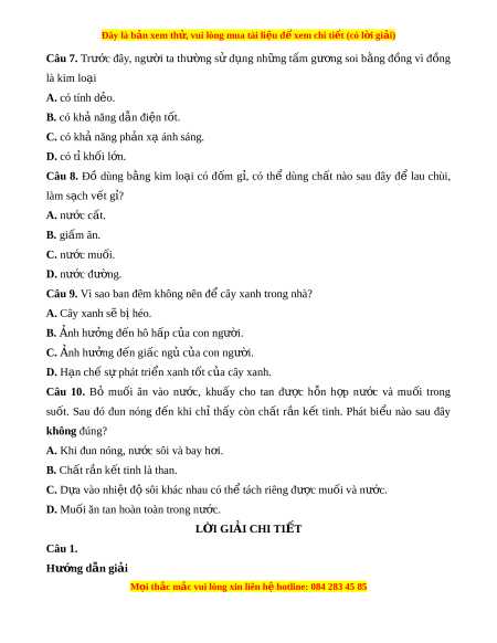 Đây là bản xem th , vu ử i lòng mua tài li u ệ đ xe ể m chi ti t (c ế ó l i ờ gi i ả ) Câu 7. Trư c ớ đây, ngư i ờ ta thư ng ờ s d ử ng ụ nh ng t ữ m ấ gư ng ơ soi b ng ằ đ ng vì ồ đ ng ồ là kim lo i ạ A. có tính d o. ẻ B. có kh năng ả dẫn đi n t ệ ốt. C. có khả năng ph n ả x ánh s ạ áng. D. có tỉ khối l n. ớ