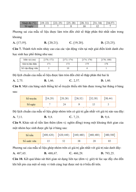 Phương sai của mẫu số liệu ghép nhóm trên có giá trị gần nhất với giá trị nào dưới đây: A. 487,65. B. 488,67. C. 460,29. D. 793,25.