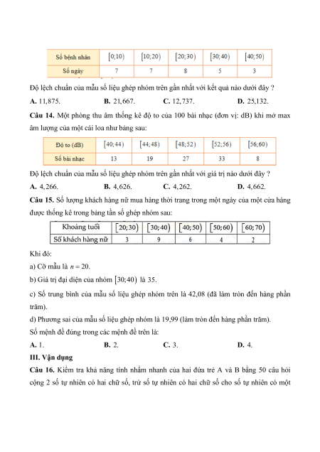 Độ lệch chuẩn của mẫu số liệu ghép nhóm trên gần nhất với kết quả nào dưới đây ? A. 11,875. B. 21,667. C. 12,737. D. 25,132.