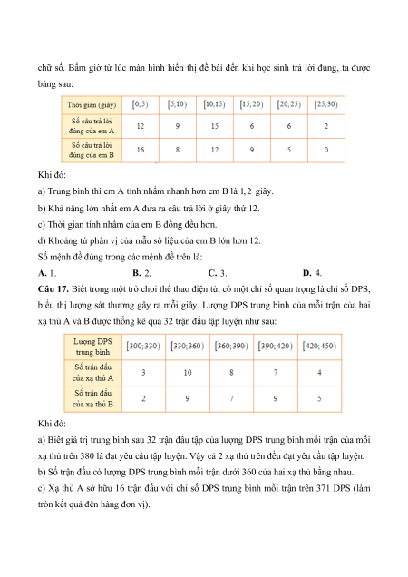 Câu 16. Kiểm tra khả năng tính nhẩm nhanh của hai đứa trẻ A và B bằng 50 câu hỏi