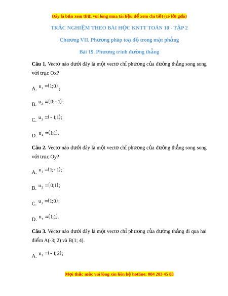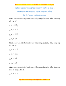 Đây là bản xem th , vu ử i lòng mua tài li u ệ đ xe ể m chi ti t (c ế ó l i ờ gi i ả ) TRẮC NGHI M Ệ THEO BÀI H C Ọ KNTT TOÁN 10 - T P Ậ 2 Chư ng ơ VII. Phư ng ơ pháp to đ ạ t ộ rong m t ặ ph ng ẳ Bài 19. Phư ng t ơ rình đư ng t ờ h ng ẳ