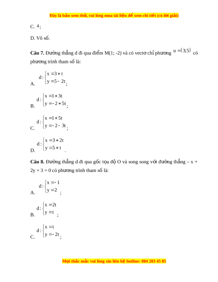 Đây là bản xem th , vu ử i lòng mua tài li u ệ đ xe ể m chi ti t (c ế ó l i ờ gi i ả ) C. 4 ; D. Vô số. Câu 7. Đư ng ờ th ng ẳ d đi qua đi m ể M(1; -2) và có vect ơ ch ỉphư ng ơ u 3;5 có phư ng t ơ rình tham s l ố à: x 3 t d : A. y 5 2t ; x 1 3t d : B. y 2 5t ; x 1 5t d : C. y 2 3t ; x 3 2t d : D. y 5 t . Câu 8. Đư ng ờ th ng ẳ d đi qua g c ố t a ọ đ ộ O và song song v i ớ đư ng ờ th ng ẳ – x + 2y + 3 = 0 có phư ng t ơ rình tham s l ố à: x 1 d : A. y 2 ; x 2 t d : B. y t ; x t d : C. y 2t ; M i