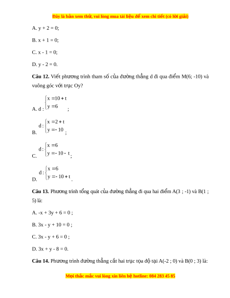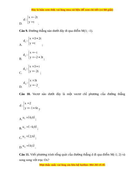 Đây là bản xem th , vu ử i lòng mua tài li u ệ đ xe ể m chi ti t (c ế ó l i ờ gi i ả ) x 2t d : D. y t . Câu 9. Đư ng t ờ h ng ẳ nào dư i ớ đây đi qua đi m ể M(1; -1). x 3 2t d : 1 A. y t ; x t d : 2 B. y 2 3t ; x 3 t d : 3 C. y 2t ; x 3 t d : 4 D. y 2 .