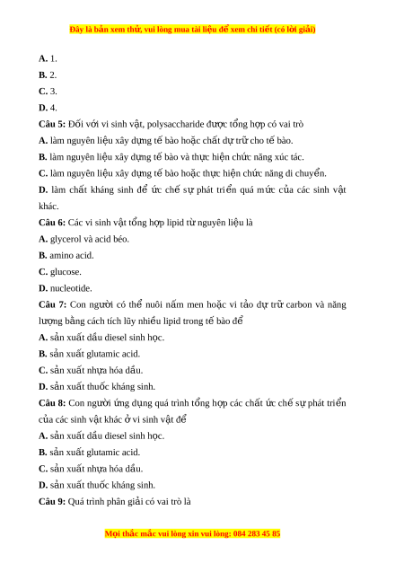 Đây là bản xem th , vu ử i lòng mua tài li u ệ đ xe ể m chi ti t (c ế ó l i ờ gi i ả ) A. 1. B. 2. C. 3. D. 4. Câu 5: Đôi v i ớ vi sinh v t ậ , polysaccharide đư c ợ t ng h ô p ợ có vai trò