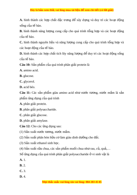 D. hình thanh các h p ợ ch t ấ tích lũy năng lư ng ợ đ ê duy trì các ho t ạ đ ng ô s ng ô c a t u bao. ê Câu 10: S n ả ph m ẩ c a u quá trình phân gi i ả protein la A. amino acid. B. glucose. C. glycerol. D. acid béo. Câu 11: Các s n ả ph m ẩ giau amino acid như nư c ớ tư ng, ơ nư c ớ m m ắ la s n ả ph m ẩ ng ứ d ng c ụ a quá t u rình A. phân gi i ả protein. B. phân gi i ả polysaccharide. C. phân gi i ả glucose. D. phân gi i ả amylase. Câu 12: Cho các ng d ứ ng ụ sau: (1) S n xu ả ất nư c ớ tư ng, n ơ ư c m ớ m ắ . (2) S n xu ả ất phân bón h u c ữ ơ lam giau dinh dư ng cho đ ỡ t ấ . (3) S n xu ả ất ethanol sinh h c. o (4) S n xu ả ất s a ữ chua, các s n ả ph m ẩ mu i ô chua nh r ư au, c , qu u ,… ả Sô ng d ứ ng ụ c a quá t u rình phân gi i ả polysaccharide vi ơ sinh v t ậ la A. 1. B. 2. C. 3. D. 4. M i