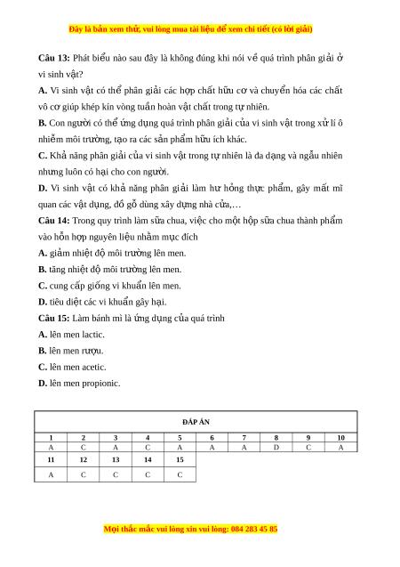 Câu 15: Lam bánh mì la ng ứ d ng c ụ a quá t u rình A. lên men lactic. B. lên men rư u. ợ C. lên men acetic. D. lên men propionic. ĐÁP ÁN 1 2 3 4 5 6 7 8 9 10 A C A C A A A D C A 11 12 13 14 15 A C C C C M i ọ thắc m c