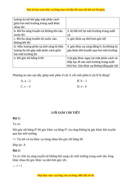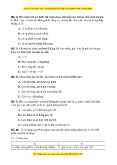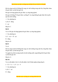 Khi góc tới tăng (giảm) thì góc khúc xạ cũng tăng (giảm) Đáp án: D Bài 4: A, B, C - đúng