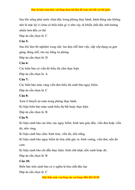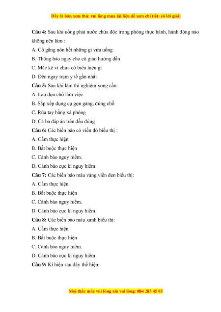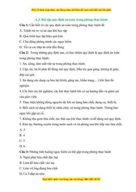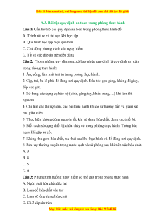 Các câu còn lại là những quy tắc gây mất an toàn trong phòng thực hành Đáp án cần chọn là: C Câu 3: