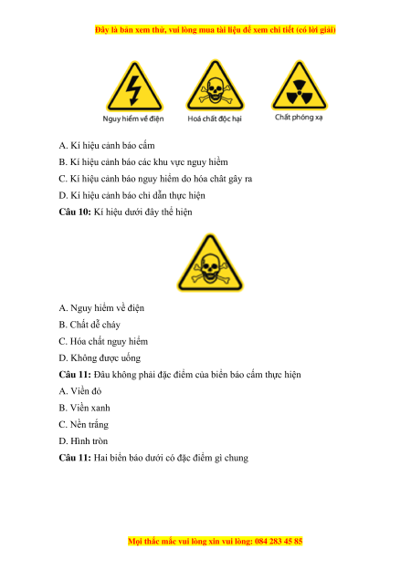 Câu 7: Các biển báo màu vàng viền đen biểu thị: A. Cấm thực hiện B. Bắt buộc thực hiện C. Cảnh báo nguy hiểm.