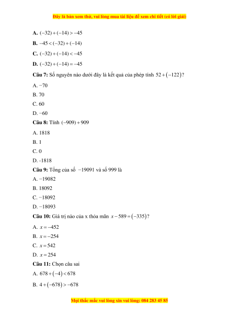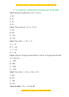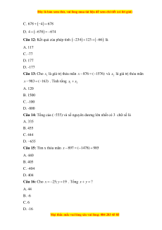 Câu 7: Số nguyên nào dưới đây là kết quả của phép tính 52 + (−122)? A. −70 B. 70 C. 60 D. −60 Câu 8: Tính ( 9 − 09) + 9 9 0 A. 1818 B. 1 C. 0 D. -1818