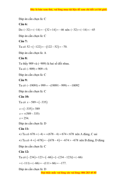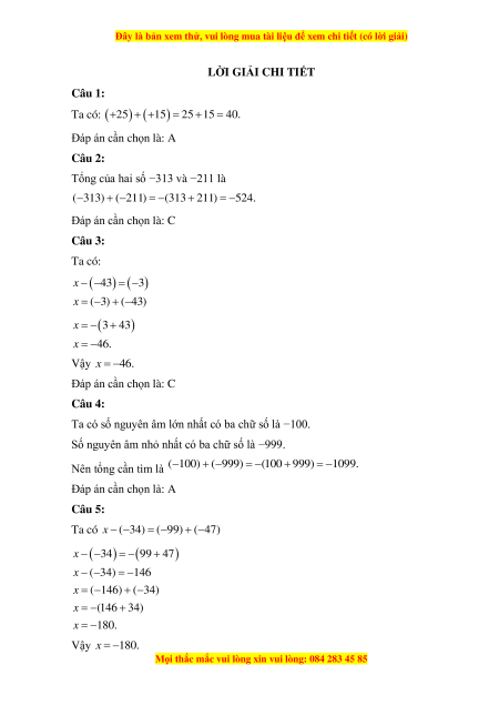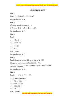 Số nguyên âm nhỏ nhất có ba chữ số là −999. Nên tổng cần tìm là − + − = − + = − ( 100) ( 999) (100 999) 109 . 9 Đáp án cần chọn là: A Câu 5: Ta có x − ( 3 − ) 4 = ( 9 − ) 9 + (−47) x − ( 34 − ) = −(99 + 47) x − ( 34 − ) = 146 − x = ( 146 − ) + ( 34 − ) x = − 146 ( + 34) x = 180. − Vậy x = 180. −