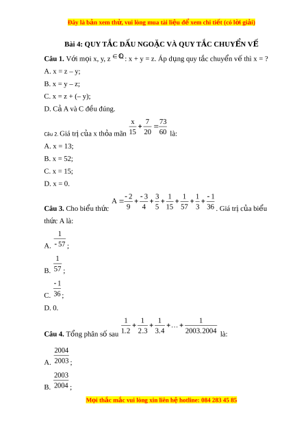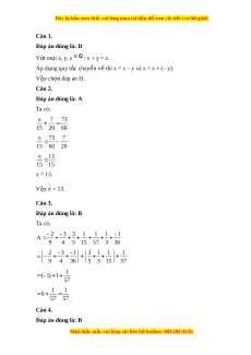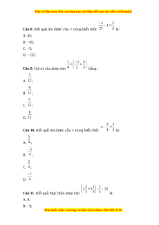 ọ x, y, z : x + y = z. Áp d ng quy t ụ ắc chuy n v ể ế thì x = ? A. x = z – y; B. x = y – z; C. x = z + (– y); D. Cả A và C đ u đúng. ề x 7 73 Câu 2. Giá tr c ị a x t ủ h a ỏ mãn 15 20 60 là: A. x = 13; B. x = 52; C. x = 15; D. x = 0. 2 3 3 1 1 1 1 A Câu 3. Cho bi u t ể h c ứ 9 4 5 15 57 3 36 . Giá tr c ị a bi ủ u ể th c ứ A là: 1 A. 57 ; 1 B. 57 ; 1 C. 36 ; D. 0. 1 1 1 1