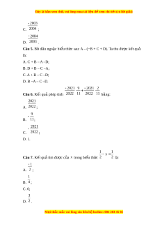 Câu 6. Kết quả phép tính 2022 11 2022 11 bằng: 2021 A. 2022 ; 9 B. 11; 2021 C. 2022 ; D. 1. 1 1 x Câu 7. K t ế qu t ả ìm đư c ợ c a ủ x trong bi u t ể h c ứ 2 2 là: 1 A. 2 ; 1 B. 4 ; C. 0; 3 D. 2 . M i ọ thắc m c