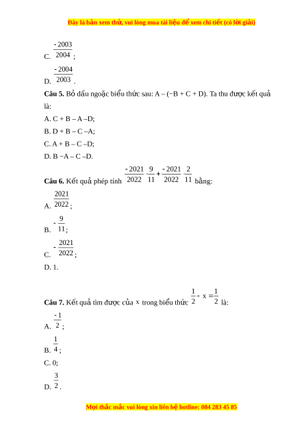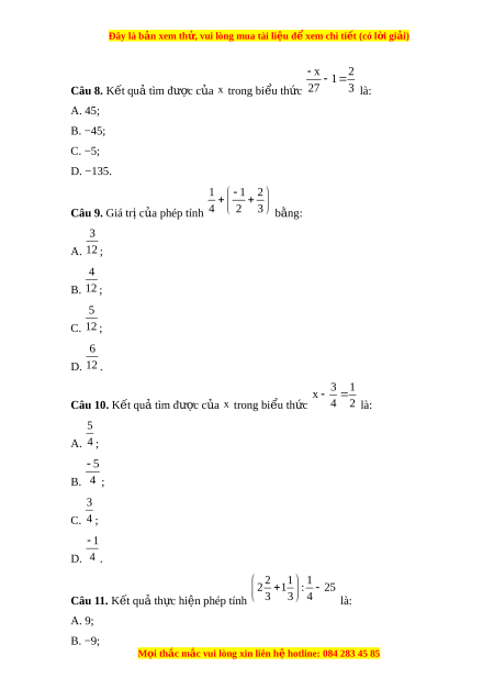 Đây là bản xem th , vu ử i lòng mua tài li u ệ đ xe ể m chi ti t ế (có l i ờ gi i ả ) x 2 1 Câu 8. K t ế qu t ả ìm đư c ợ c a ủ x trong bi u t ể h c ứ 27 3 là: A. 45; B. −45; C. −5; D. −135. 1 1 2 Câu 9. Giá tr c ị a ủ phép tính 4 2 3 b ng: ằ 3 A. 12 ; 4 B. 12 ; 5 C. 12 ; 6 D. 12 . 3 1 x Câu 10. K t ế qu t ả ìm đư c ợ c a ủ x trong bi u t ể h c ứ 4 2 là: 5 A. 4 ; 5 B. 4 ; 3 C. 4 ; 1 D. 4 . 2 1 1 2 1 : 25 Câu 11. K t ế qu t ả h c ự hi n phép ệ tính 3 3 4 là: A. 9; B. −9; M i ọ thắc m c