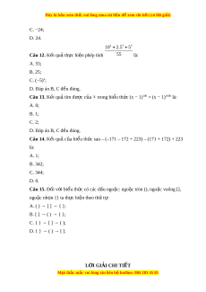 ứ au – (–171 – 172 + 223) – (171 + 172) + 223 là: A. 1; B. 342; C. 344; D. 0. Câu 15. Đ i ố v i ớ bi u t ể h c có các ứ d u ngo ấ ặc: ngo c ặ tròn (), ngo c ặ vuông [], ngo c nh ặ n ọ {} ta th c hi ự n t ệ heo th t ứ : ự A. ( ) → [ ] → { }; B. [ ] → ( ) → { }; C. { } → [ ] → ( ); D. { } → ( ) → [ ]. L I Ờ GIẢI CHI TI T Ế M i ọ thắc m c