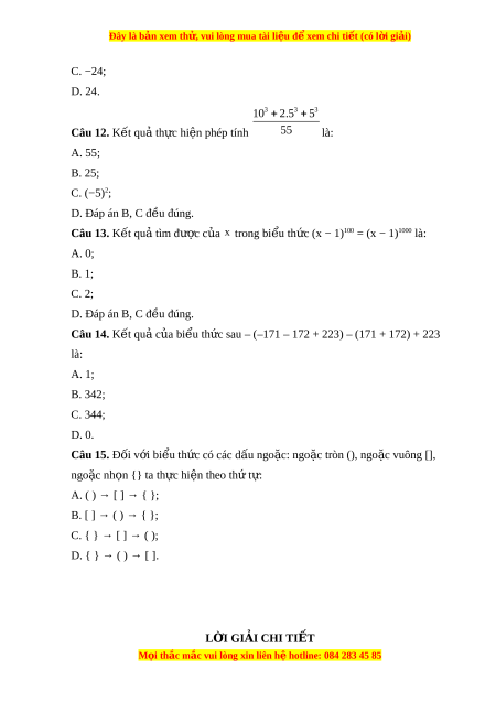 Đây là bản xem th , vu ử i lòng mua tài li u ệ đ xe ể m chi ti t ế (có l i ờ gi i ả ) C. −24; D. 24. 3 3 3 10 2.5 5 Câu 12. K t ế qu t ả h c ự hi n phép ệ tính 55 là: A. 55; B. 25; C. (−5)2; D. Đáp án B, C đ u đúng. ề Câu 13. K t ế qu t ả ìm đư c ợ c a ủ x trong bi u t ể h c (