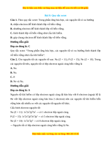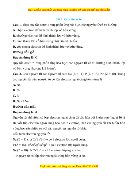 Đây là bản xem th , vu ử i lòng mua tài li u ệ đ xe ể m chi ti t (c ế ó l i ờ gi i ả ) Bài 9: Quy t c oct ắ et Câu 1. Theo quy t c ắ octet: Trong ph n ả ng hóa h ứ c, ọ các nguyên t có xu h ử ư ng ớ A. nh n ậ electron đ hì ể nh thành l p v ớ b ỏ n v ề ng. ữ B. như ng el ờ ectron đ hì ể nh thành l p v ớ ỏ b n v ề ng. ữ C. hình thành l p v ớ ỏ b n v ề ng nh ữ c ư a ủ khí hi m ế .