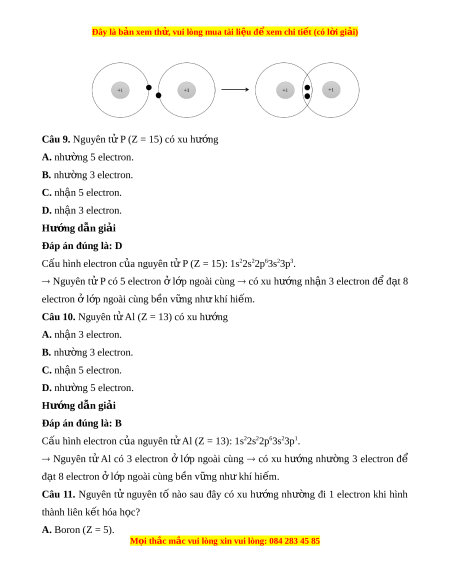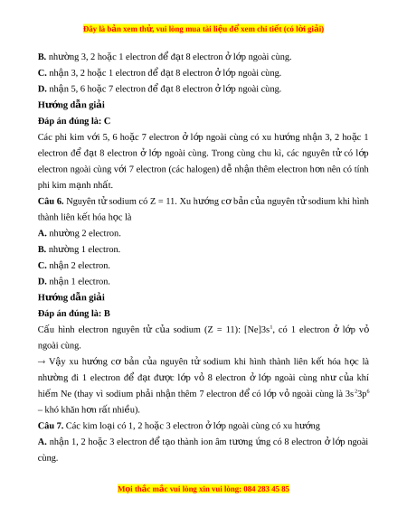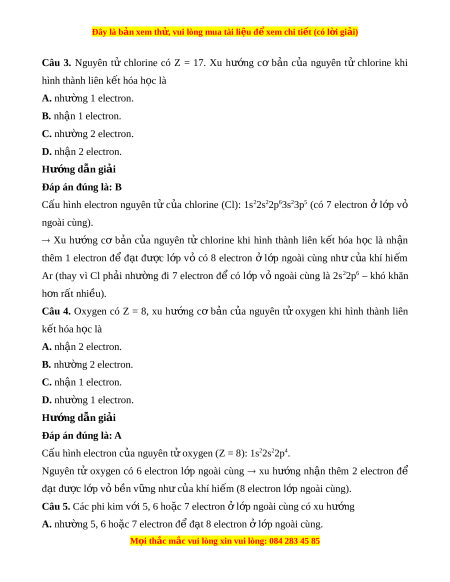 Đây là bản xem th , vu ử i lòng mua tài li u ệ đ xe ể m chi ti t (c ế ó l i ờ gi i ả ) B. như ng 3, 2 ho ờ c ặ 1 electron đ đ ể t ạ 8 electron l ở p ngoài ớ cùng. C. nh n ậ 3, 2 ho c 1 el ặ ectron để đ t ạ 8 electron l ở p ngoài ớ cùng. D. nh n ậ 5, 6 ho c 7 el ặ ectron để đ t ạ 8 electron l ở p ngoài ớ cùng. Hư ng d ớ ẫn gi i ả Đáp án đúng là: C Các phi kim v i ớ 5, 6 ho c ặ 7 electron ở l p ớ ngoài cùng có xu hư ng ớ nh n ậ 3, 2 ho c ặ 1 electron để đ t ạ 8 electron ở l p