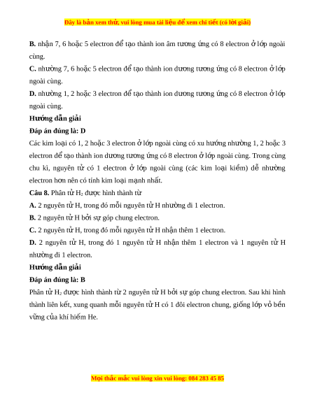 Đây là bản xem th , vu ử i lòng mua tài li u ệ đ xe ể m chi ti t (c ế ó l i ờ gi i ả ) B. nh n ậ 7, 6 ho c ặ 5 electron đ ể t o ạ thành ion âm tư ng ơ ng ứ có 8 electron ở l p ớ ngoài cùng. C. như ng ờ 7, 6 ho c ặ 5 electron đ ể t o ạ thành ion dư ng ơ tư ng ơ ng ứ có 8 electron ở l p ớ ngoài cùng. D. như ng ờ 1, 2 ho c ặ 3 electron đ ể t o ạ thành ion dư ng ơ tư ng ơ ng ứ có 8 electron ở l p ớ ngoài cùng. Hư ng d ớ ẫn gi i ả Đáp án đúng là: D Các kim lo i