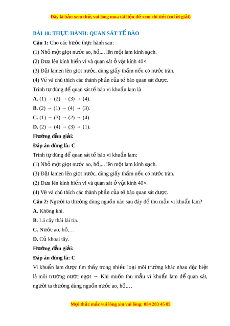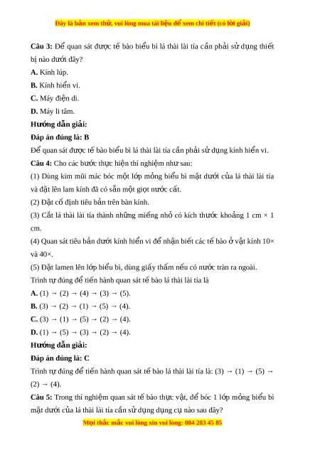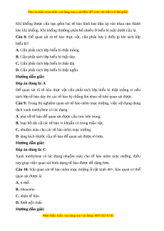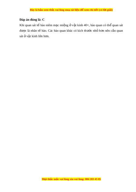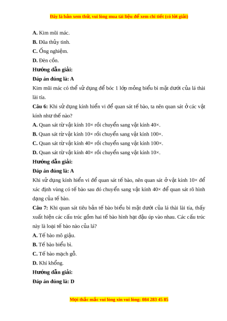 Đây là bản xem th , vu ử i lòng mua tài li u ệ đ xe ể m chi ti t ế (có l i ờ gi i ả ) A. Kim mũi mac. B. Đũa th y u tinh. C. Ống nghiêm. D. Đèn cồn. Hư ng ớ d n gi ẫ i ả : Đáp án đúng là: A Kim mũi mac co thể s ư d ng u đ ể boc 1 l p ơ m ng ỏ bi u ể bi m t ặ dư i ơ c a u la thai lai tía. Câu 6: Khi sư d ng u kính hi n ể vi đ ể quan sat t ê bao, ta nên quan sat ở cac v t ậ kính nh t ư h nao? ê A. Quan sat t v ư t ậ kính 10× r i ồ chuy n s ể ang v t ậ kính 40×. B. Quan sat t v ư t ậ kính 10× r i ồ chuy n s ể ang v t ậ kính 100×. C. Quan sat t v ư t ậ kính 40× r i ồ chuy n s ể ang v t ậ kính 100×. D. Quan sat t v ư t ậ kính 40× r i ồ chuy n s ể ang v t ậ kính 10×. Hư ng ớ d n gi ẫ i ả : Đáp án đúng là: A Khi sư d ng u kính hi n ể vi đ ể quan sat t ê bao, nên quan sat ở v t ậ kính 10× để xac đ nh i vung co t ê bao sau đo chuy n ể sang v t ậ kính 40× đ ể quan sat ro hinh d ng c ạ a u t bao. ê
