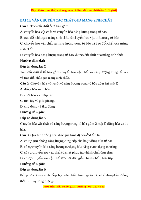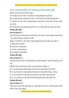 Đây là bản xem th , vu ử i lòng mua tài li u ệ đ xe ể m chi ti t ế (có l i ờ gi i ả ) BÀI 11: VẬN CHUY N Ể CÁC CH T Ấ QUA MÀNG SINH CH T Ấ Câu 1: Trao đôi ch t â t ơ bao g ê m ô A. chuy n hoa v ê t â chât va chuy n hoa năng l ê ư ng ơ trong t bao. ê B. trao đôi ch t â qua mang sinh ch t â va chuy n hoa ê v t â ch t â trong t bao. ê C. chuy n ê hoa v t â ch t â va năng lư ng ơ trong t ê bao va trao đ i ô ch t â qua mang sinh chât. D. chuy n hoa năng l ê ư ng ơ trong t bao ê va trao đ i ô ch t â qua mang sinh ch t â . Hư ng ớ d n gi ẫ i ả : Đáp án đúng là: C Trao đ i ô ch t â ơ t ê bao g m ô chuy n ê hoa v t â ch t â va năng lư ng ơ trong t ê bao va trao đôi ch t â qua mang sinh ch t â . Câu 2: Chuy n ê hoa v t â ch t â va năng lư ng t ơ rong tê bao g m ô hai m t ặ la
