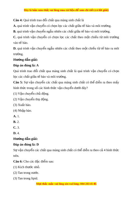 Câu 4: Qua trinh trao đ i ô ch t â qua mang sinh ch t â la A. qua trinh v n chuy â n ê co ch n l ọ c ọ cac ch t â gi a t ữ bao va ê môi trư ng. ơ B. qua trinh v n â chuy n ng ê u nhi â ên cac ch t â gi a ữ t bao va m ê ôi trư ng. ơ C. qua trinh v n â chuy n ê co ch n ọ l c ọ cac ch t â theo m t ộ chi u ề tư môi trư ng ơ vao tê bao. D. qua trinh v n â chuy n ê ng u â nhiên cac ch t â theo m t ộ chi u ề t ư t ê bao ra môi trư ng. ơ Hư ng d ớ ẫn gi i ả : Đáp án đúng là: A Qua trinh trao đ i ô ch t â qua mang sinh ch t â la qua trinh v n â chuy n ê co ch n ọ l c ọ cac chât gi a t ữ bao va ê môi trư ng. ơ Câu 5: S ư v n â chuy n ê cac ch t â qua mang sinh ch t â co th ê di n ê ra theo m y â hinh th c t ư rong s cac ô hinh th c ư v n chuy â n ê dư i ơ đây? (1) V n â chuy n ch ê đ ủ ng. ộ (2) V n â chuy n t ê h đ ụ ng. ộ (3) Xu t â bao. (4) Nh p bao. â A. 1. B. 2. C. 3. D. 4. Hư ng d ớ ẫn gi i ả : Đáp án đúng là: D S v ư n â chuy n cac ê ch t â qua mang sinh ch t â co th di ê n r ê a theo c 4 hi a nh th c ư trên.