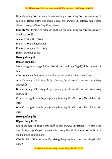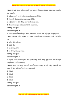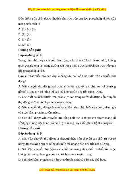Đây là bản xem th , vu ử i lòng mua tài li u ệ đ xe ể m chi ti t ế (có l i ờ gi i ả ) Đ c ặ đi m ê c a ủ ch t â đư c ơ khu ch ê tan tr c ư ti p ê qua l p ơ phospholipid kép c a ủ mang sinh chât la A. (1), (2), (3). B. (1), (2). C. (1), (3). D. (2), (3). Hư ng ớ d n gi ẫ i ả : Đáp án đúng là: C Trong hinh th c ư v n â chuy n ê th ụ đ ng, ộ cac ch t â co kich thư c ơ nh , ỏ không phân c c ( ư không tan trong nư c) ơ , tan trong lipid đư c ơ khu ch t ê an tr c t ư i p qua ê l p phos ơ pholipid kép. Câu 7: Phat bi u