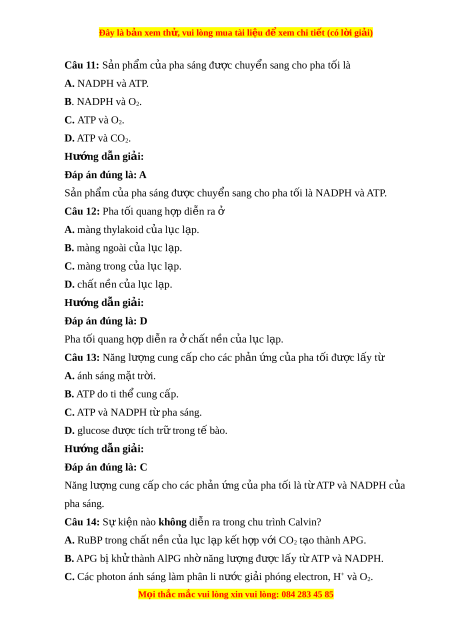 Đây là bản xem th , vu ử i lòng mua tài li u ệ đ xe ể m chi ti t (c ế ó l i ờ gi i ả ) A. quá trình s ư d ng u ATP và NADPH đ ê c đ ô nh C ị O2 hình thành nên ch t ấ h u ư cơ ch y ủ u l ế à carbohydrate. B. quá trình chuy n ê hóa năng lư ng ợ ánh sáng mà h ê s c ă t ô h p ấ th u đư c ợ